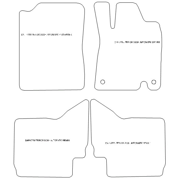 FREE UK Shipping for orders over £39.99 £ .Free Coloured Trim SAVE £4.99 - Limited Time Offer. Home >> Daihatsu Car Mats >> Daihatsu Terios Car Mat >>Daihatsu Terios Automatic Car Mats Daihatsu Terios Automatic Car Mats +17 Unsure If This Is Your Car? Please Double Click The Find Button 1Enter Your Car Reg 2Confirm Your Vehicle 3We Send Perfect Fit Mats From Only £24.99 SAVE £10 FREE Trim Upgrade SAVE £4.99 FREE Shipping on Orders> £49.99 Manufactured in the UK Guaranteed Quality and Fit 12 Month Warranty Set of 4 Mats with Fixings Fast, Tracked Delivery Award Winning Service Higher Quality Carpets We offer 4 choices of high quality automotive£carpet, plus the option of thick industrial rubber. £Automotive£carpet is specifically£designed to protect your car interior: £hard wearing, water£resistant, fire retardant with an anti-slip rubber backing. Mat Colour (Standard) Black Grey Beige Blue Mat Colour (Premium) Black Grey Beige Mat Colour (Ultimate) Black Grey Beige Mat Colour (Platinum) Black Grey Beige Black Mat Colour (Rubber -4mm) Black Edging Colour (Cloth) Black Red Beige Grey Blue Green Yellow Navy Edging Colour (Leather) Black Leather Blue Leather Red Leather White Leather Beige Leather Grey Leather Edging Colour (Striped Cloth) Black & Blue Striped Black & Red Striped Black & Black Black & Green Black & Silver Black & Yellow Car Mats Guide Higher Quality Carpets We offer 4 choices of high quality automotive£carpet, plus the option of thick industrial rubber. £Automotive£carpet is specifically£designed to protect your car interior: £hard wearing, water£resistant, fire retardant with an anti-slip rubber backing. Standard Mats 650g £ Short Pile, Loop Weave £ Rough Touch, More Difficult to Clean £ Come With a Heel Pad / Fixing Clips £ Available in Five Colours £ Fully Customisable Product £ Manufactured to Order in the UK (3 Days) Premium Mats 800g £ Short "Straight Cut" Pile £ Soft Touch and Easy to Clear £ Come with a Heel Pad / Fixing Clips £ Available in Three Colours £ Fully Customisable Product £ Manufactured to Order in the UK (3 Days) Ultimate Mats 980g £ Short "Straight Cut" Pile £ Soft Touch and Easy to Clear £ No Heel Pad (carpet too thick) £ Available in Five Colours £ Fully Customisable Product £ Manufactured to Order in the UK (3 Days) Platinum Mats 4070g £ Luxury Deep Twist Pile £ Easy to Clean £ No Heel Pad (carpet too thick) £ Available in Four Colours £ Fully Customisable Product £ Manufactured to Order in the UK (3 Days) Car Mat Gallery A selection from our wide range of carpets, trims and other personalisation Standard Mats 650g Our budget range - effective, hard wearing protection for your car interior. Come with a heel pad for added durability. Premium Mats 800g A premium feel car mat - soft-touch, tufted nylon with a short pile. Come with a heel pad for added durability. Ultimate Mats 980g Our best selling, main dealer equivalent car mats. Short, soft touch pile, extremely durable (no heel pad required), outstanding value for money. Platinum Mats 4070g Our deluxe range - a luxurious deep, twisted pile. Add a touch of class and 'take your shoes off' comfort to your car interior. Rubber Mats Our robust rubber range - industrial style, cross-hatch pattern. Used as car mats OR as 'over mats' to protect your existing car mats. Boot Liners & Bumper Protectors Premium Rubber Boot Liner Lipped Edge Boot Liner Neoprene Bumper Protector Personalisation Embroidered Logo Custom Text Embroidered Logo Step 1: Select Your Mat Quality All of our car mats come in a set of 4. These mats will fit your Daihatsu Terios Car Mat 2006 Onwards. Please check the image of the mats. The image is the actual pattern used to manufacture the mats. This pattern is identical to the manufacturers original template. Details of the fixings provided with the mats can be seen in the technical specifications tab. Budget Range Loop Weave Pile 550g £24.99 was £34.99 NEW! Budget friendly car mats will do a great job of protecting your car and come with a heat-weld heel pad. Standard Loop Weave Pile 650g £29.99 was £39.99 Our Standard range - effective, hard wearing protection for your car interior. Come with a sewn-on heel pad for added durability. View Standard Mats Premium Soft Tufted Nylon 800g £44.99 was £54.99 FREE Shipping A premium feel car mat - soft-touch, tufted nylon with a short pile. Come with a heel pad for added durability. View Premium Mats Ultimate Thick Tufted Nylon 980g £59.99 was £69.99 FREE Shipping Our best selling, main dealer equivalent car mats. Short, soft touch pile, extremely durable (no heel pad required), outstanding value for money. Black Grey Beige Blue Red View Ultimate Mats - BEST SELLER Platinum Twist Wool Effect 4070g £99.99 was £109.99 FREE Shipping Our deluxe range - a luxurious deep, twisted pile. Add a touch of class and 'take your shoes off' comfort to your car interior. View Platinum Mats Rubber Cross Hatch Rubber £49.99 was £59.99 FREE Shipping Our robust rubber range - industrial style, cross-hatch pattern. Used as car mats OR as 'over mats' to protect your existing car mats. View Rubber Mats Step 2: Select your colour This quality of car mat is available in the following selection of colours: Black Confirm your Order Your order is for Mat Quality: BudgetCarpet colour: Black MatEdge Colour: Black Edge These mats will be produced with a 'black' edge as Standard Express Checkout You Only Pay: £24.99 Was £39.9924.99GBP Customer Reviews Add Personalisation? If you would like to customise the look of your mats by adding a coloured contrasting edge or a logo / custom text, please see the options below. Step 3: Add a Contrasting Edge Cloth, leather and suede Constrasting Cloth Edge. now only £0.00 Saving £4.99